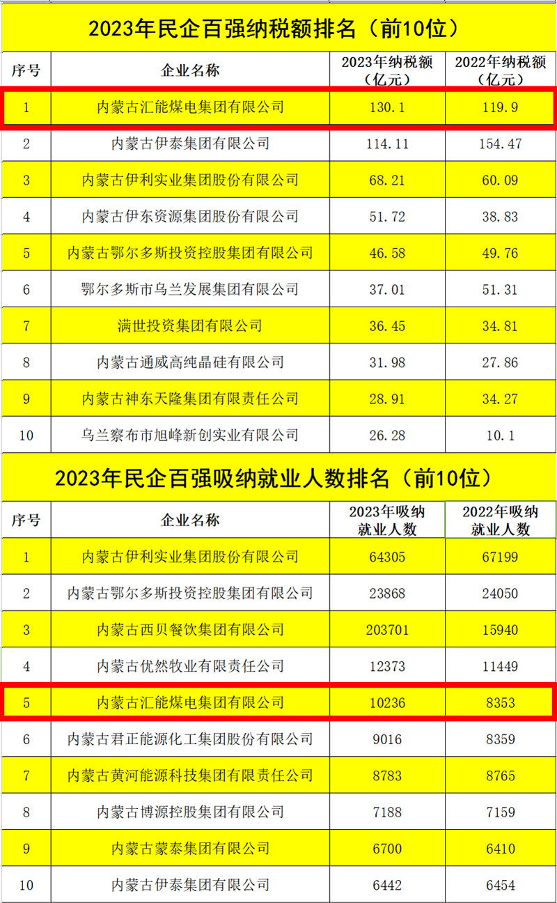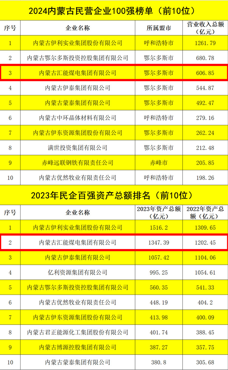 6月25日,2024內(nèi)蒙古民營企業(yè)100強(qiáng)發(fā)布會(huì)暨內(nèi)蒙古自治區(qū)促進(jìn)“兩個(gè)健康”現(xiàn)場(chǎng)會(huì)在內(nèi)蒙古鄂爾多斯市舉行。會(huì)上公布了2024內(nèi)蒙古民營企業(yè)100強(qiáng)系列榜單,匯能集團(tuán)以606.85億元營收總額榮列百強(qiáng)榜單第三位,較上年增長110.41億元,上升一位;資產(chǎn)總額1347.39億元,較去年增長144.94億元,仍位列民企百強(qiáng)第二位;納稅額130.1億元,位列民企百強(qiáng)第一位,較上年增長10.2億元,上升一位;吸納就業(yè)人數(shù)10236人,位列民企百強(qiáng)第五位,較上年增加1883人,上升兩位。